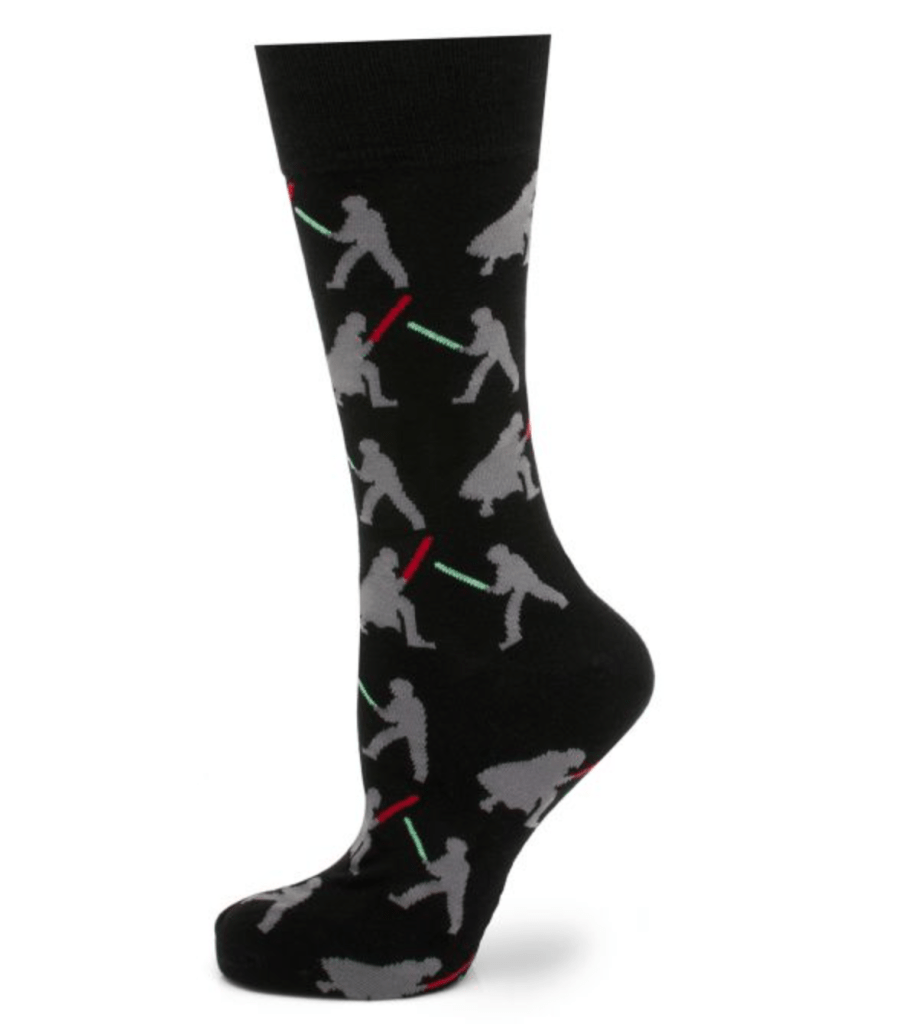 But the glory in the socks doesn’t stop there. The infamous battle between Jedi Knight Luke Skywalker and Darth Vader is recreated in these one of a kind looking socks. The subtle design of the gray figures looks incredible with the colors of the lightsabers. The combination is a perfect one.